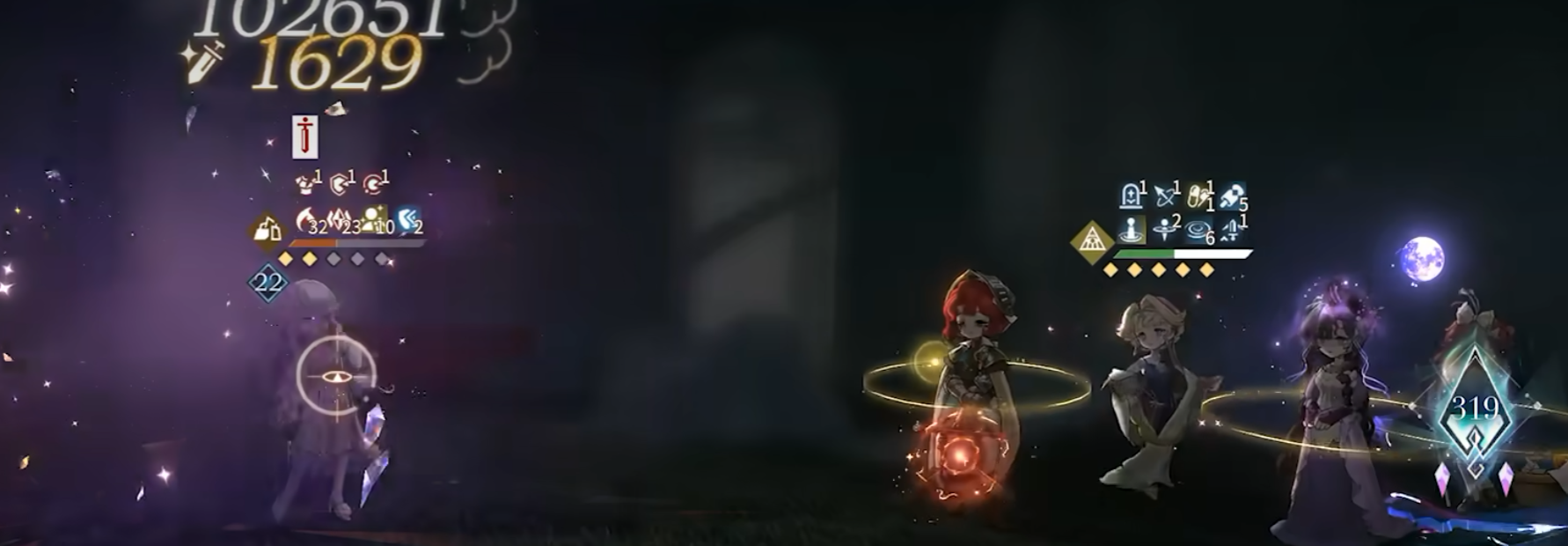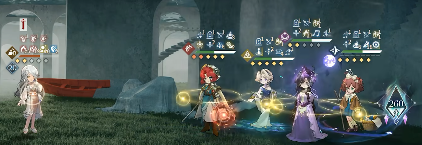 - 第 4 回合:出伊索尔德 2 技能、贝丽尔任意两张法术牌,玛尔纱任意法术牌,热度到 40,伊索尔德进入终曲,余辉队成型!