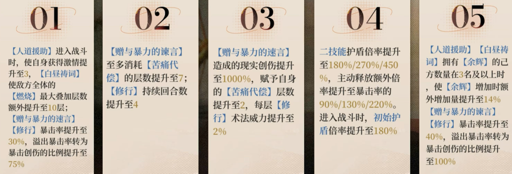 释放后给全队加 3 回合 “修行” buff,提供 20% 暴击率、溢出暴击转暴伤,还有叠层的法术威力(最高 10%)和暴伤(最高 25%)。开得越频繁,buff 层数越高,余辉队配上这个直接上天!