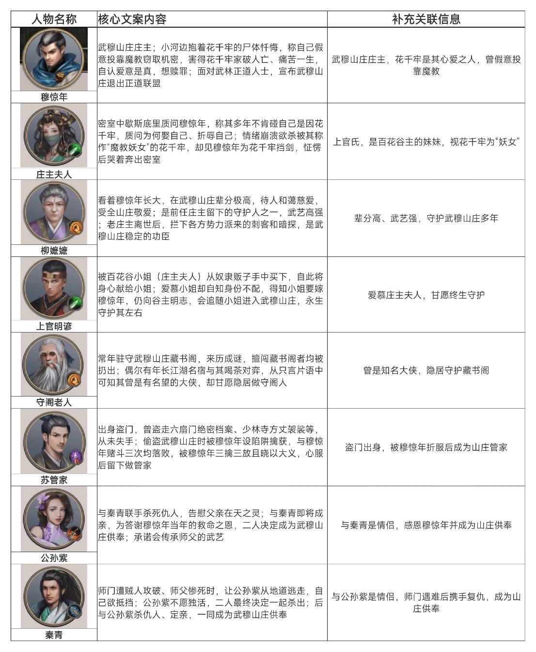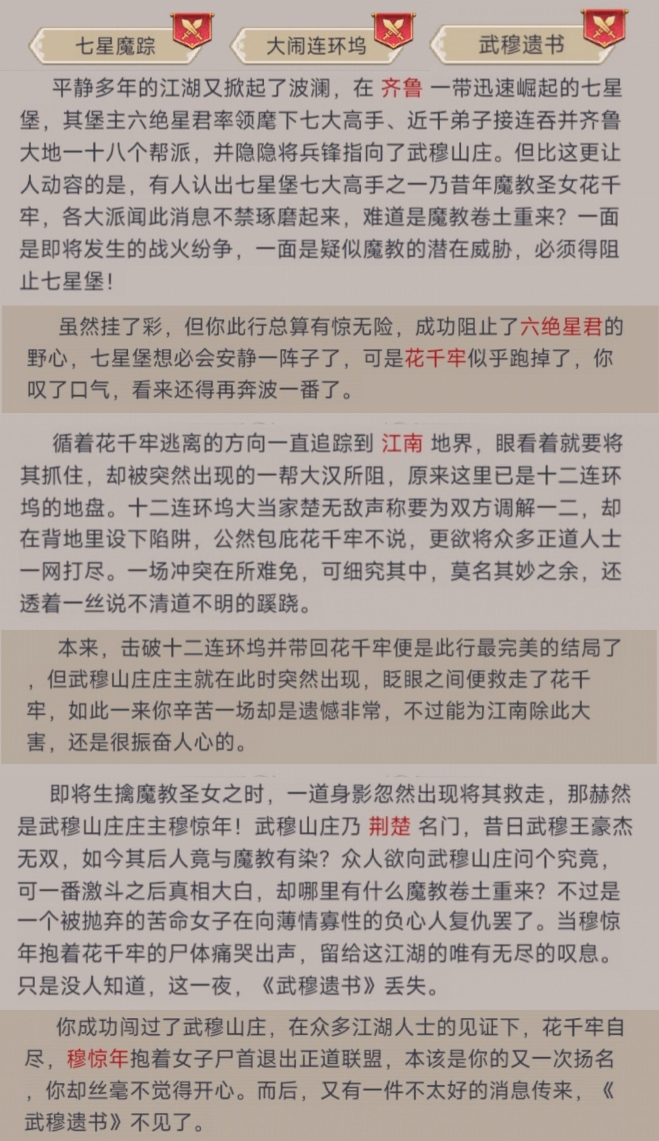 随后问责的大部队赶到,然后又是玩家对战BOSS情节,最终穆惊年战败,坦白了自己的陈年往事,众人这才明白这并非魔教崛起,只是一个被抛弃的苦命女子向薄情寡性的负心人复仇罢了(依旧原文)。随后,花千牢心理防线侧底奔溃后当众自尽(不知道怎么个自尽法,后面有剧情又说是被暗杀,感觉有点冲突),穆惊年宣布武墓山庄退出正道联盟。当穆惊年抱着花千牢的尸体痛哭出声,留给这江湖的唯有无尽的叹息(还是原文)。