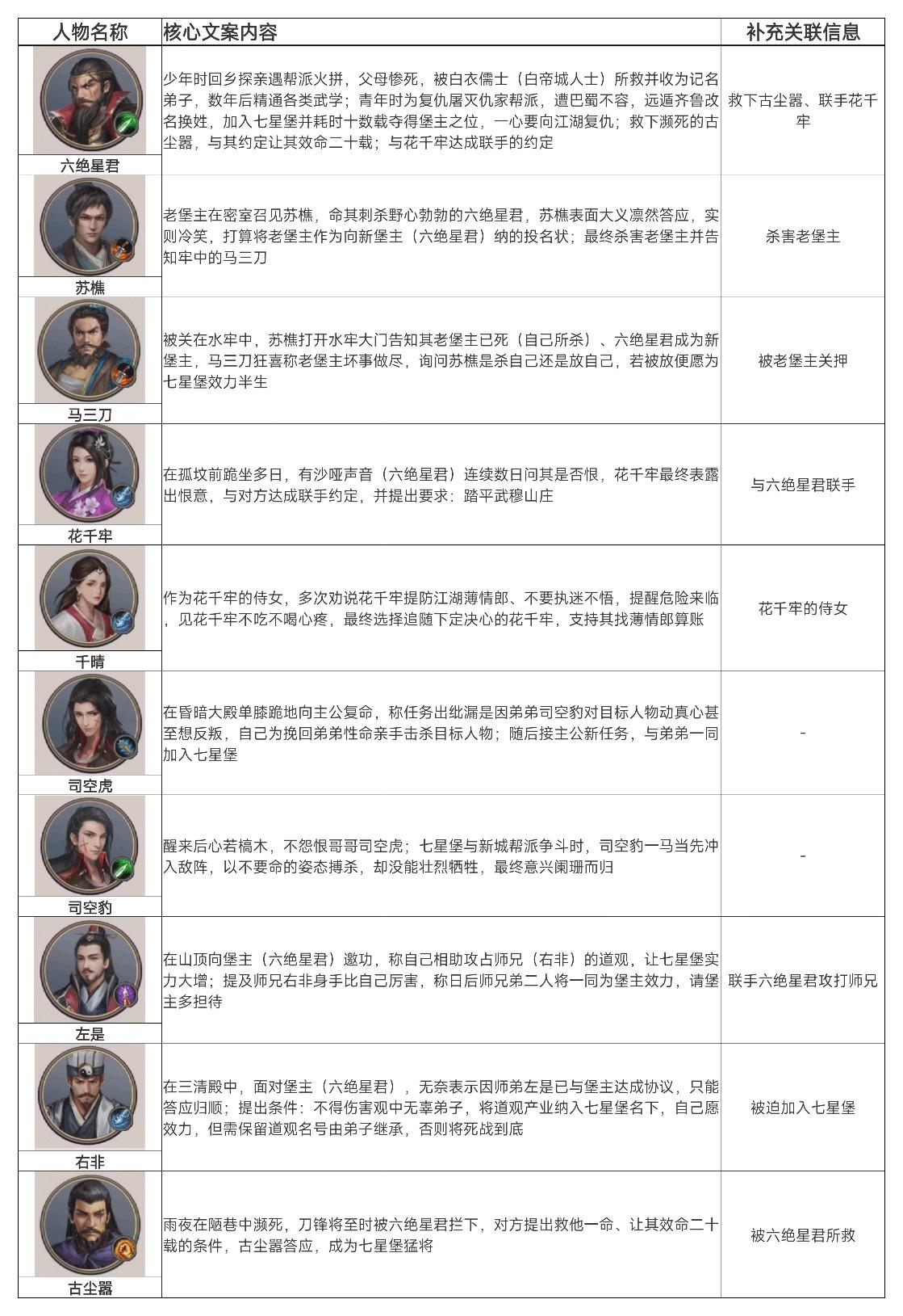 玩家以行侠仗义的侠客身份(游戏内未明确玩家其它身份)参与对七星堡的围剿,最终击败六绝星君,阻止了六绝星君的野心(游戏原文,具体是击杀还是擒获不清楚),但花千牢在战败后逃离,玩家还将继续追捕。