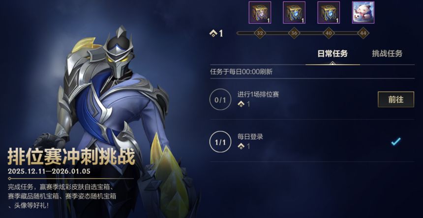 即日起至2026年1月5日23:59,召唤师完成排位赛冲刺挑战任务,即可获得赛季炫彩皮肤自选宝箱、赛季藏品随机宝箱、赛季姿态随机宝箱、头像-雪的味道等好礼!