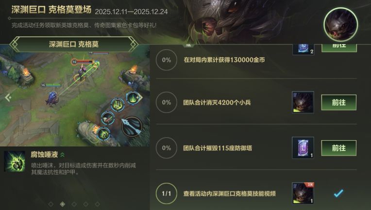 即日起至12月24日23:59,召唤师完成活动任务即可领取新英雄克格莫、传奇图集紫色卡包等好礼~
