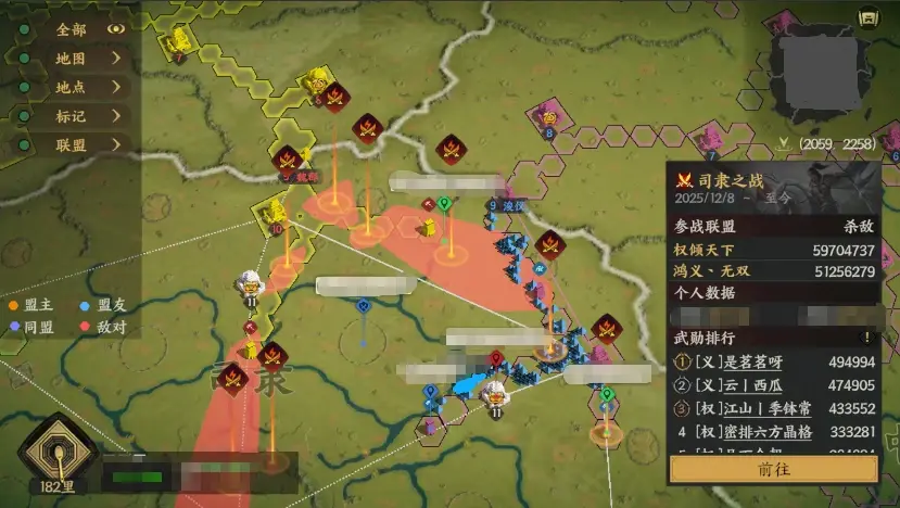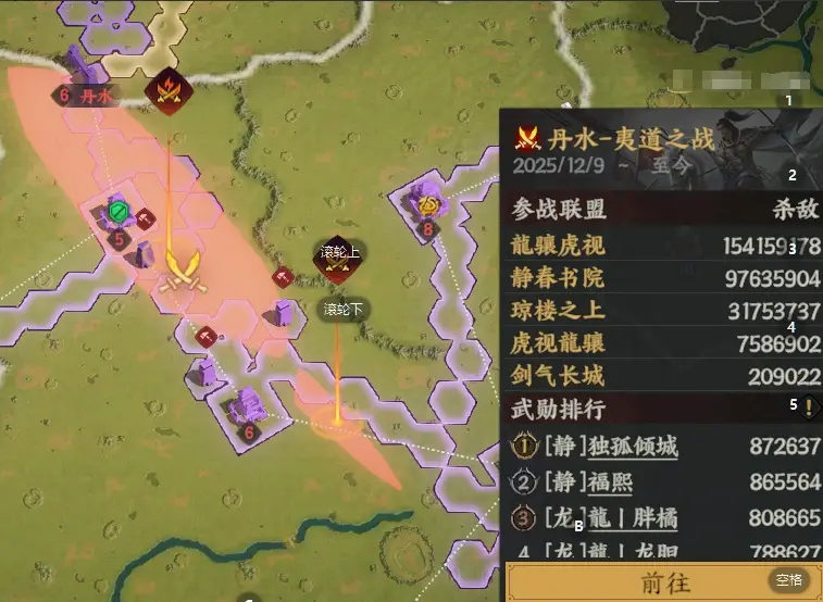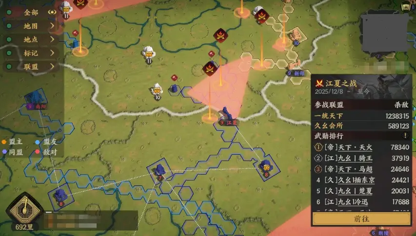 S2-42区资源州战场早已遍地烽火!江汉战场,【长歌行】与【对酒当歌】持续在九级城附近激烈对抗,双方势均力敌。不过值得一提的是,后续【傲丨世】的分盟【天云宗】与【对酒当歌】结为同盟,现已远征至九级城,协助【对酒当歌】对抗【长歌行】。不知他们的加入又会对战局产生怎样的影响?关中地区,【傲丨世】与【征戰丶天下】均已连接到八级城,目前【傲丨世】仅差最后一个烽火台就能与八级城接壤,届时将与【征戰丶天下】产生正面冲突。