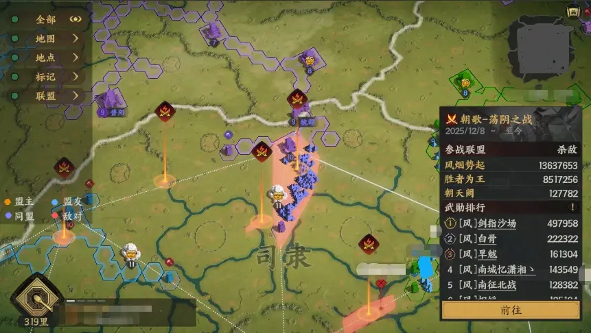 S2-40区的阵营对抗同样精彩,六大联盟分成两大阵营,正式在司隶展开对决,【朝天厥】携手【一统天下】与【胜者为王】,对抗由【江山藏龙】、【久幺会所】、【风烟势起】组成的三家同盟,六盟现已全部进入司隶。