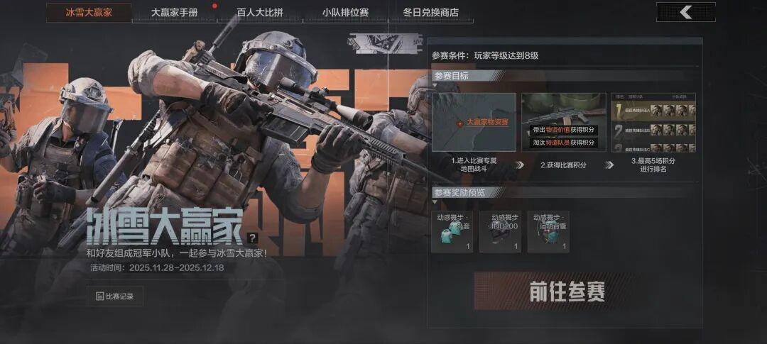 累积积分即可解锁大赢家手册,获取特殊收藏品【冰狮雕像模型】与【动感舞步】外观套装等奖励;参与小队排位赛获得大赢家兑换币,前往冬日兑换商店免费兑换大赢家限定动态名片、称号等奖励!