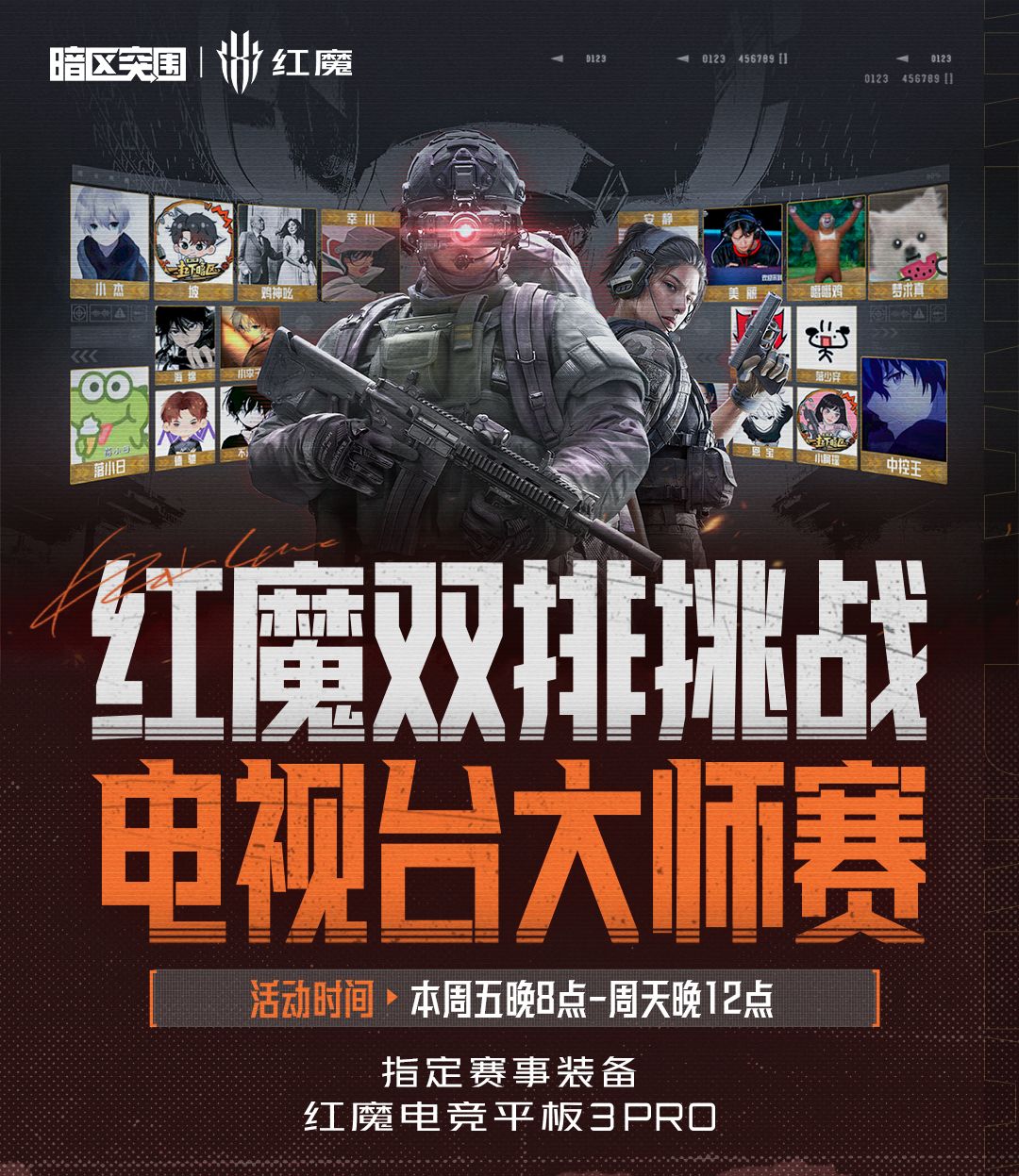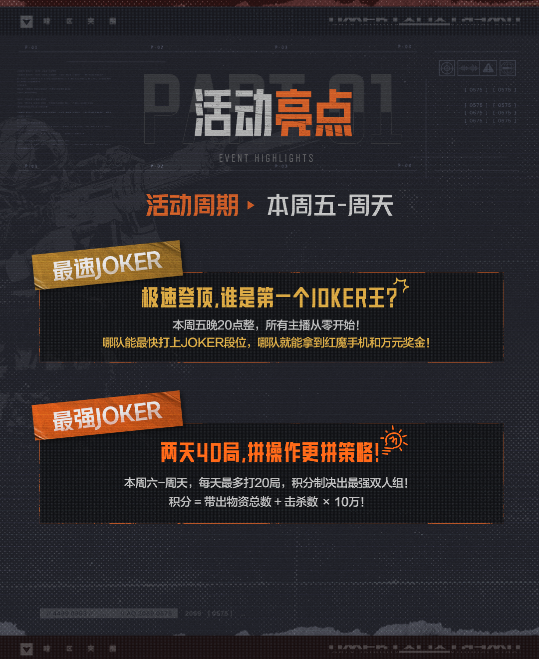 【最强JOKER赛道】本周六到周天,每天开启最多20局大师赛挑战,双天共40局,比拼物资+击杀的总积分,总积分最高的队伍也可获得10000元奖金+红魔手机一台。