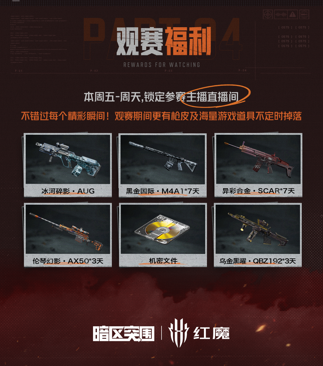 本周五到周天,锁定参赛主播直播间,不错过每个精彩瞬间!观赛期间更有枪皮及海量游戏道具不定时掉落!
