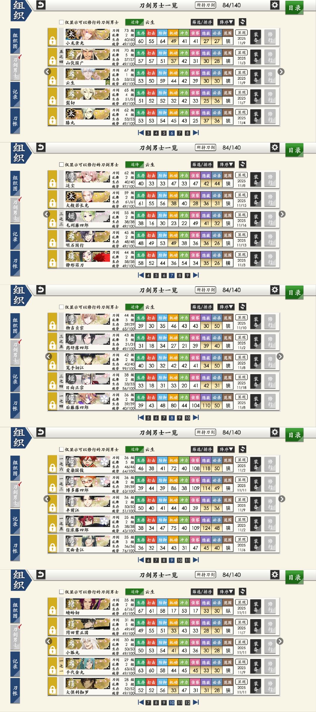 前两张图是我打图的阵容,后两张是我所有30级以上的刀剑(30级以下的就没截进来)我的极化刀只有四个短刀,都是36级,还有一个在极化路上没回来。想给没满99级的普刀练级,但是又打不过去。请问前辈大佬们可以帮我看看应该怎么配队?或者说这个活动我无法练级了,只能用99级普刀们慢慢打?