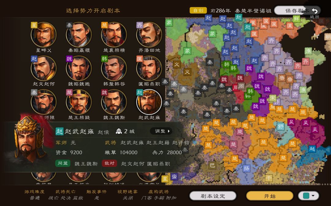 剧本背景介绍:公元前286年,因穷兵黩武,宋康王【戴偃】暴政失民心,被齐湣王联合楚、魏三国伐灭。然齐泯王【田地】灭宋后骄傲自满,接连挑战诸侯,最终引发五国伐齐,自己也兵败被杀。齐国陷入混乱,田单辅佐齐襄王【田法章】上位,以“火牛阵”打退匽军复国。秦昭襄王嬴稷派司马错攻魏,夺安邑等地,巩固东出根基。赵惠文王【赵何】冷眼旁观齐灭宋,避免卷入纷争,同时重用蔺相如、廉颇,稳固赵国内部权力,专注整顿内政。楚倾襄王【熊横】参与灭宋分赃,短暂获利,之后表面参与五国伐齐,实则趁机派淖齿入齐夺权,后因与齐矛盾激化撤军......战国的大势就此拉开!