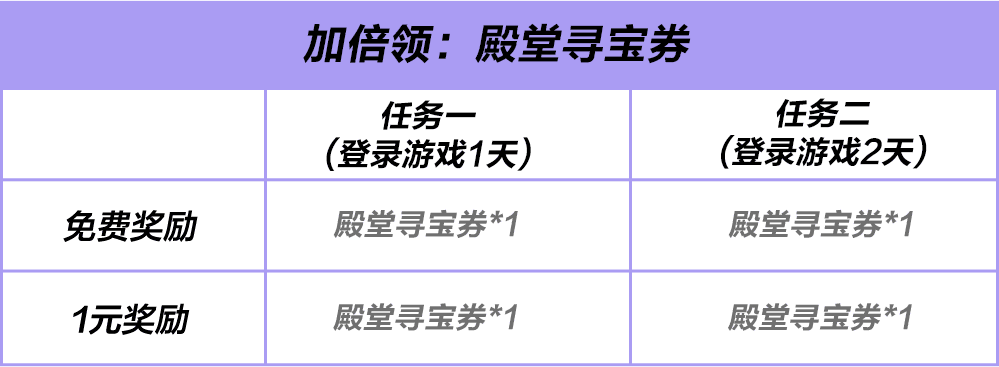 登录游戏2天,可免费领取殿堂寻宝券*2。在活动内付费1元即可加倍再领殿堂寻宝券*2。