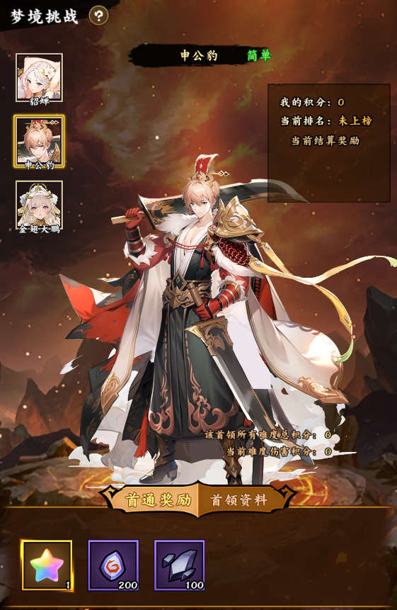 活动期间,每天可获得3次梦境挑战次数(最多可累计10次),参与挑战本轮出现的梦境英雄(貂蝉、申公豹、金翅大鹏)。梦境挑战共分5个难度,每个梦境的挑战进度各自独立。挑战成功后,方可进入下一个难度,最后难度boss为无限生命。挑战成功并选择保存战绩才会消耗挑战次数并获得积分,萌主可选择最好的一次成绩进行保存。