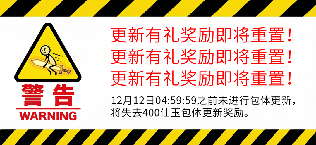 如果仙长之前未领取当前的【更新有礼】奖励(400仙玉),请务必在12月12日04:59:59位面维护前进行包体更新,领取400仙玉奖励。