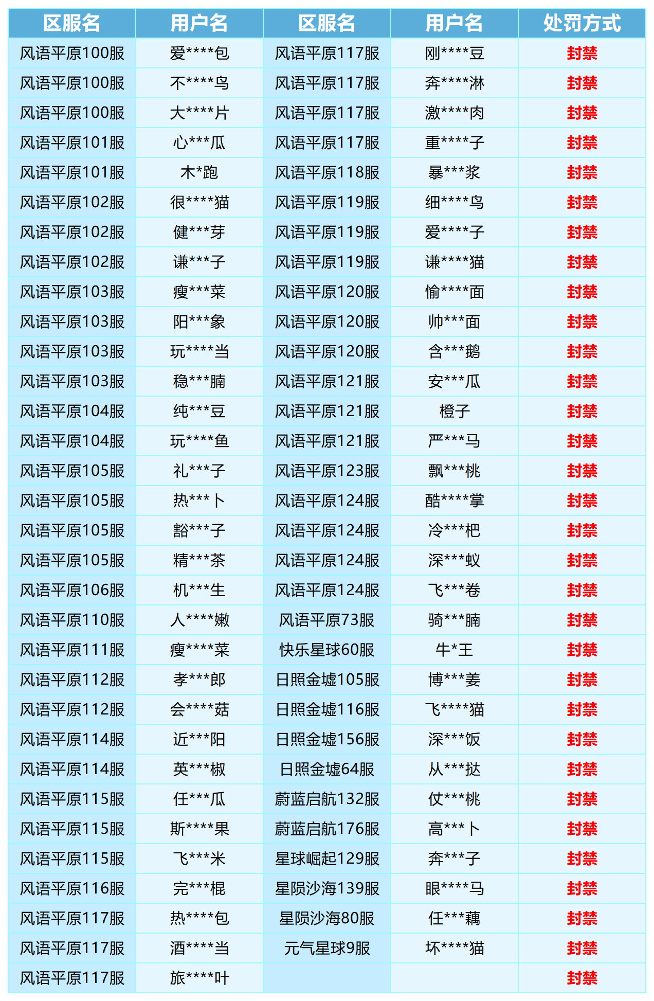 12月4日12:01至12月11日12:00期间,封禁名单公示: