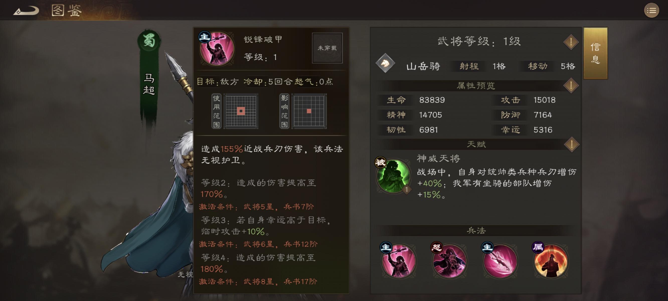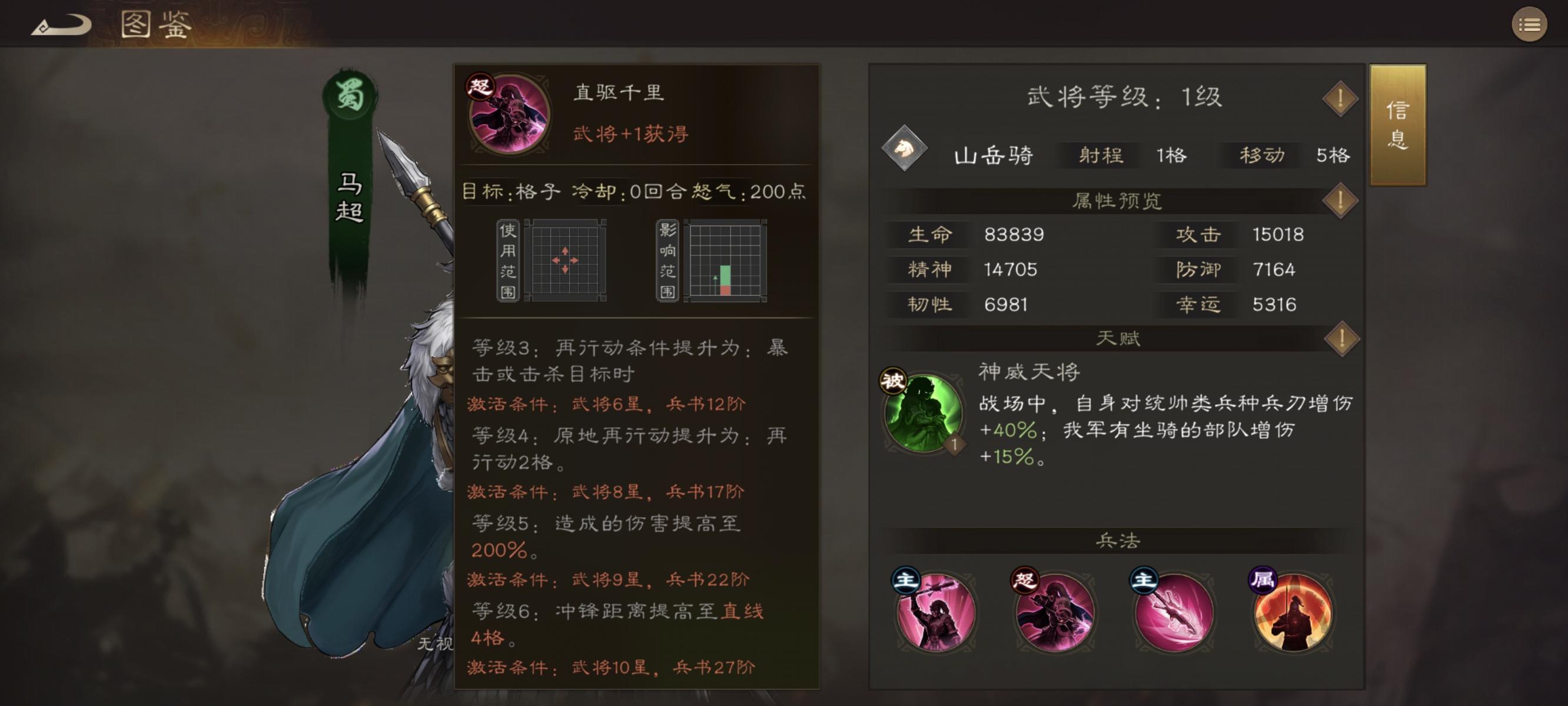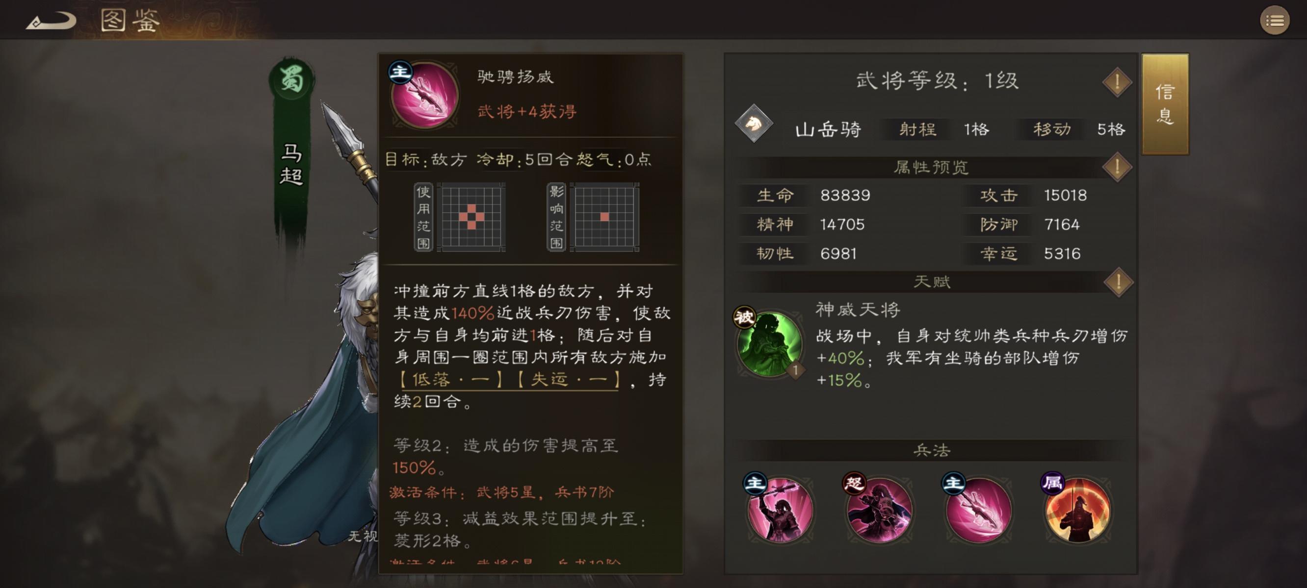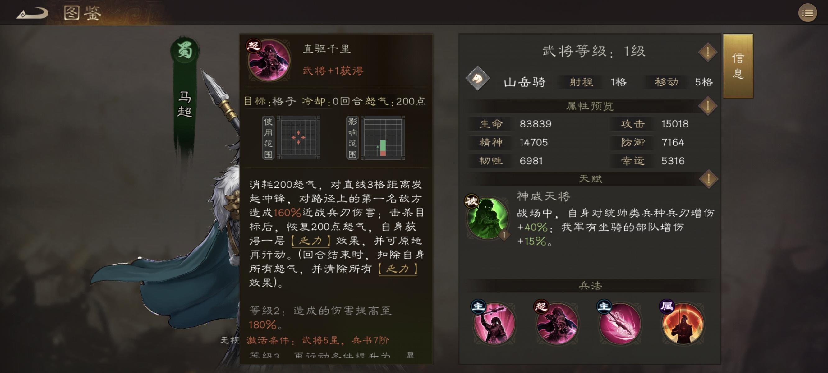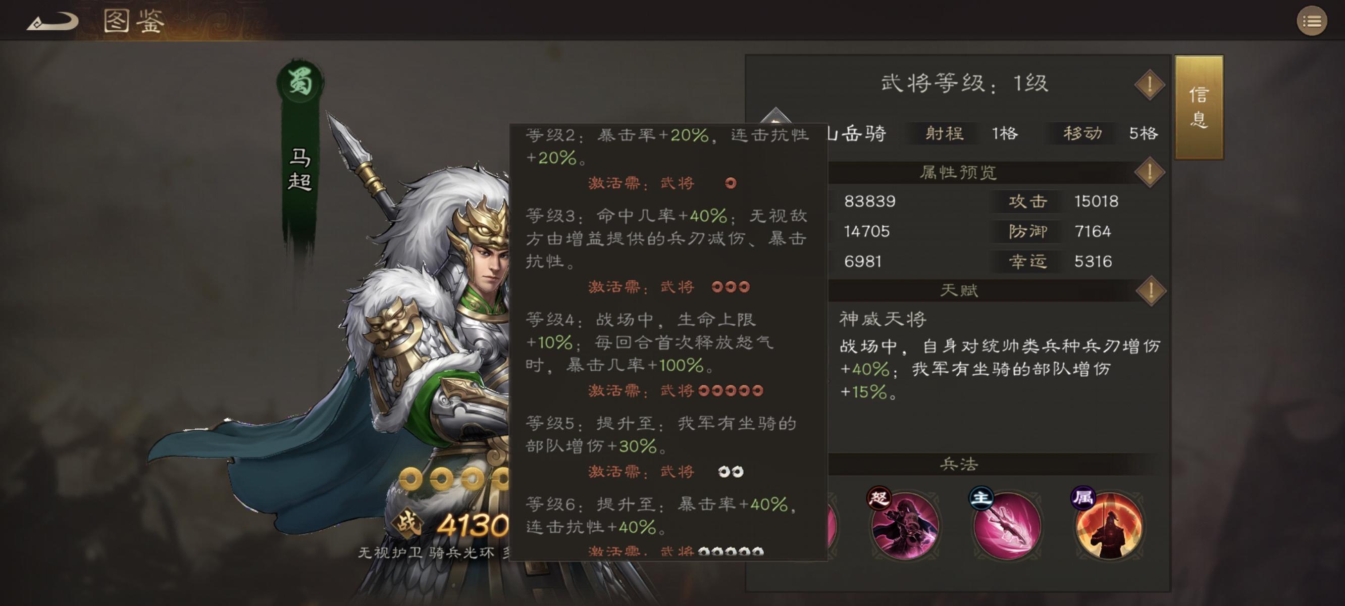 马超,羌族称之为神威天将军,天赋也很直白就叫神威天将,因为曾经杀得曹操割须断袍所以初始自带一个对统帅兵种40%增伤的特效,同时拥有一个骑兵指挥,所有骑马单位增伤+30%,描述是只要模型里有马就行,包括骑马统帅,还有后面的骑马策士,同时作为蜀国的基操,马超有40%暴击率和连击抗性,还有40%命中率且能无视所有通过增益获取的减伤和暴抗,还有10%生命值且首次释放大招增加100%暴击率,注意是增加100%暴击率而不是暴击率100%,是拥有更高上限的