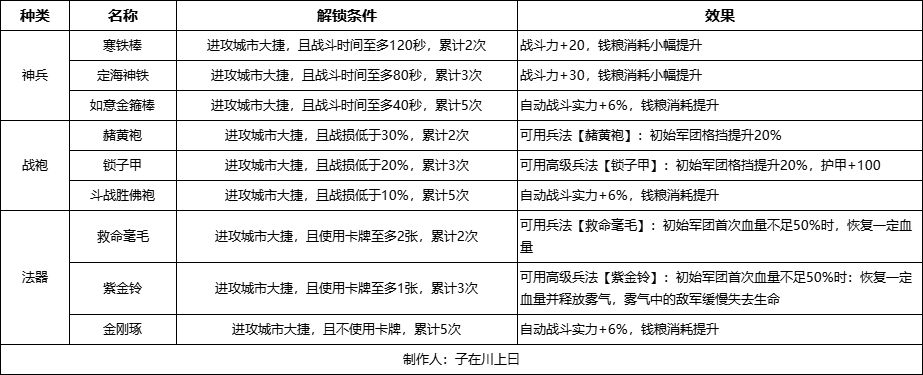 注:装备可以升级,但是升级后无法再变回原来的装备,例如同时解锁寒铁棒与定海神针后,可使用寒铁棒,并升级为定海神针,但升级为定海神针后,无法再变回寒铁棒。