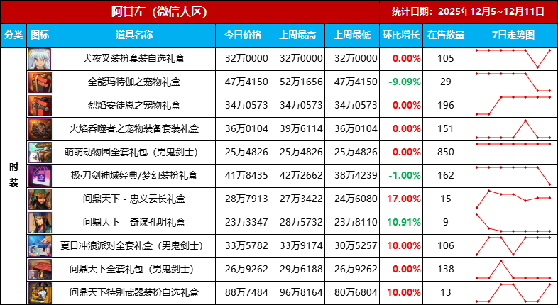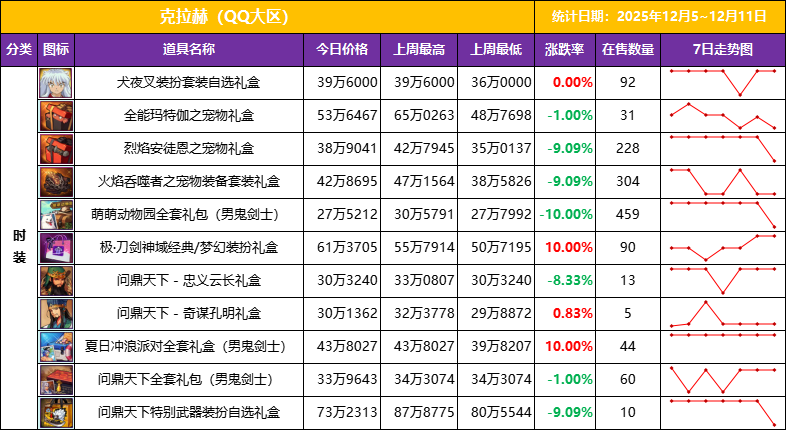 犬夜叉装扮从上周113件本周105件,是到期下架还是真卖出去了无处查询,其他时装礼盒情况都差不多,销量较为惨淡,甚至价格回落到上周最低价,结合版本进度和玩家关注点,这段时间时装礼盒是别指望有好时机了,随行就市等机会吧。