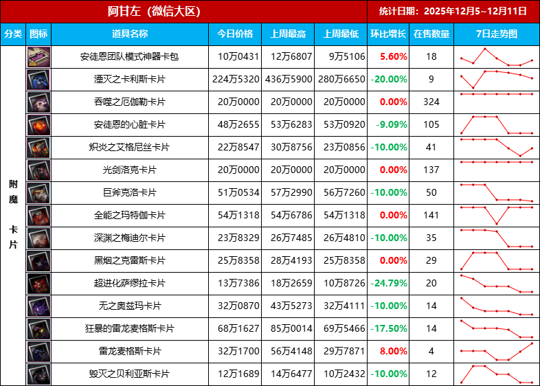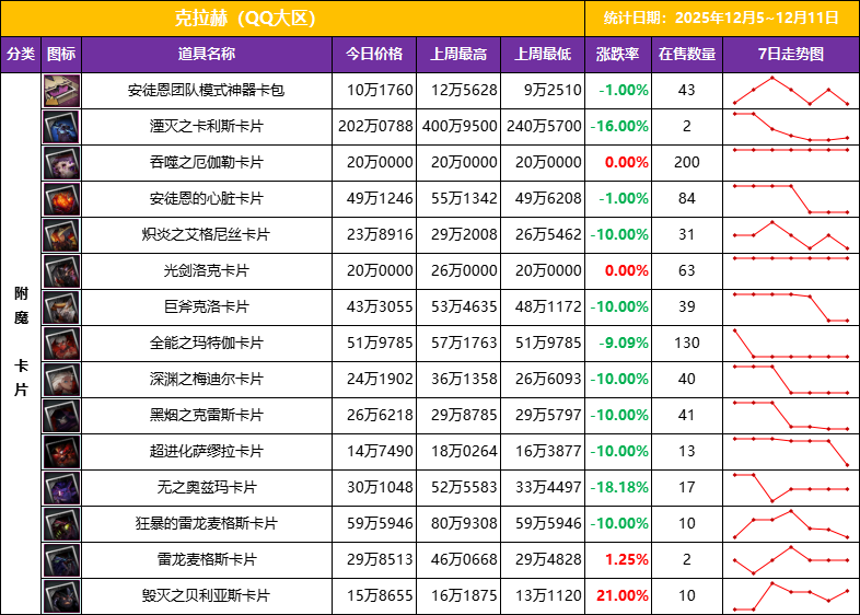价格持续下跌适合给小号捡漏,但问题是有多少玩家喜欢练小号,又有多少玩家有闲钱打造小号!附魔卡想要提升市场,目前唯一的机会是春节假期,不着急的就再等等。