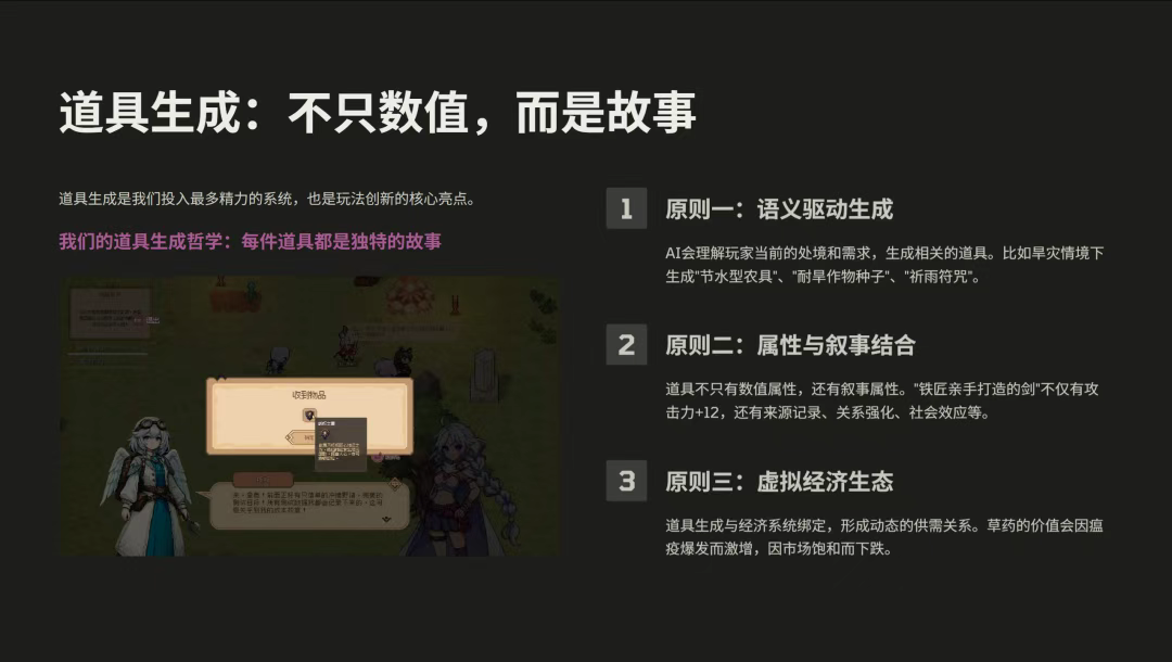 比如NPC可能会突然告诉你,他梦到了「一把游戏中不存在的传奇武器」,然后实时生成了这把武器的功能、外观和制作配方——这种由AI驱动的动态规则生成,保证了游戏长期的可玩性和惊喜感。