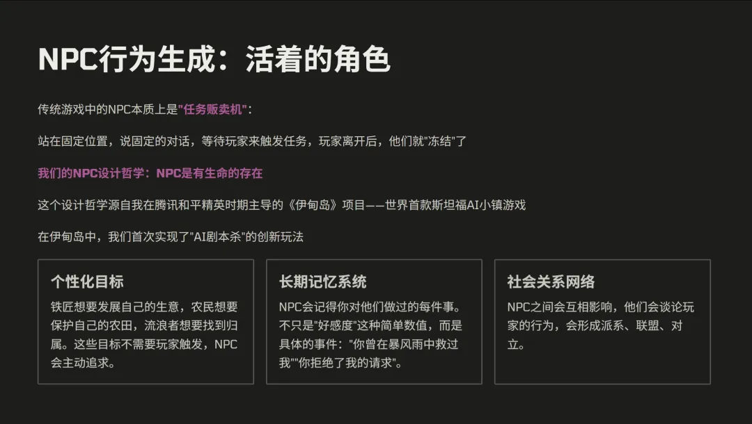 张昊阳:这个项目的雏形,可以追溯到我们在腾讯做的《伊甸岛》。当时斯坦福AI小镇的论文刚出来,我们马上以此为基础,做了一个可交互版本,验证了大模型驱动NPC玩法的可行性。
