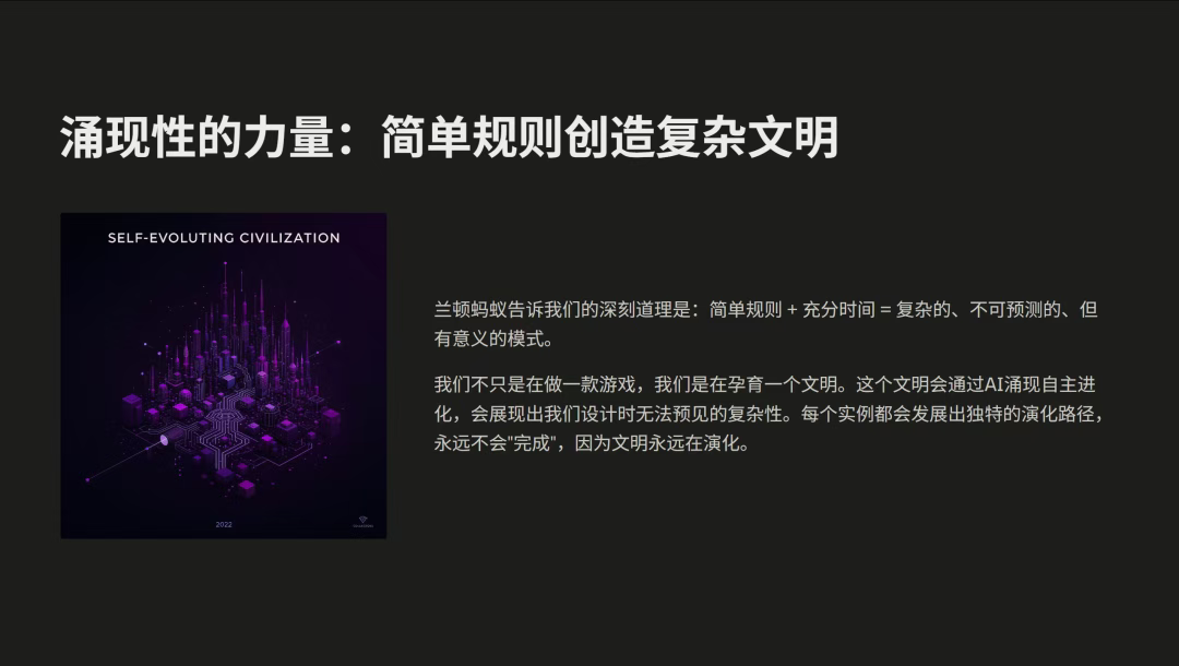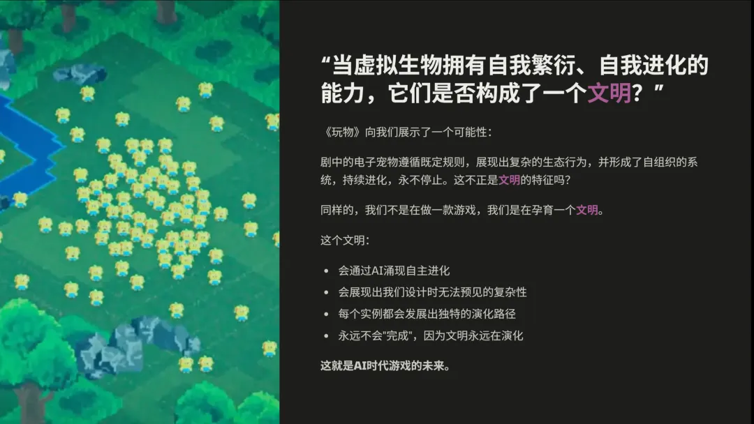 葡萄君:之前你在分享中说,过去你一直在思考,为什么花三年精心制作的游戏,玩家三周就通关了?能不能让游戏持续繁荣?但有些从业者会觉得,不该奢求做一个永不完结的游戏,也不该奢求让AI提供无限内容。