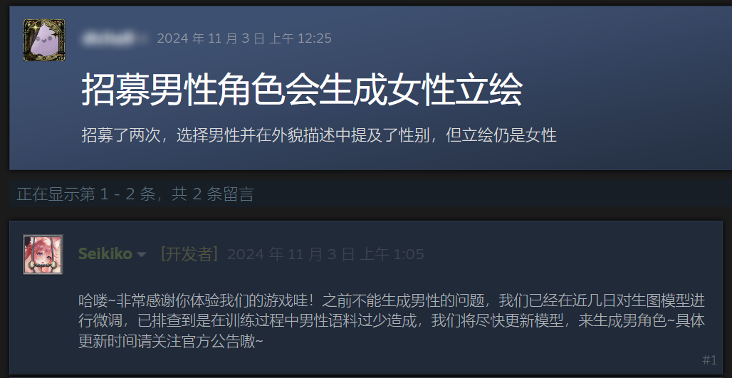 这甚至带来了一些尴尬的体验:受团队游戏设计背景和AIGC模型数据的限制,起初游戏生成男性角色比较困难,一些女性用户,本来想跟男角色互动,但发现生成的都是「小男娘」……我们只能手动绘制了很多男性角色来弥补训练数据不足的情况,现在已经支持得比较好了。