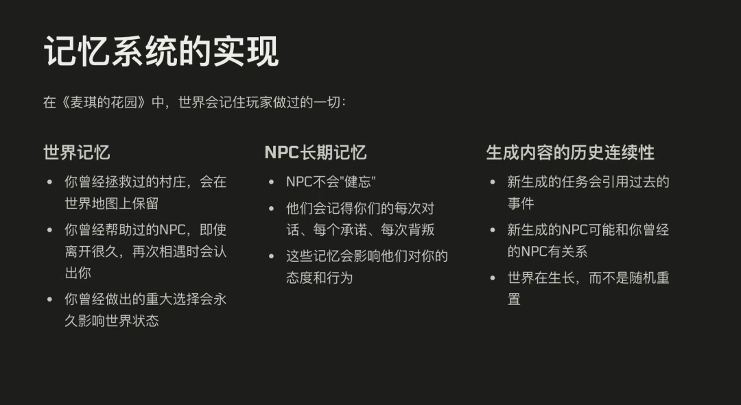 一是动态记忆系统。AI会记录和玩家互动的关键事件、对话,并将其作为未来决策和生成内容的依据。比如你今天送他一朵花,可能过几天,他就会在新任务里提到这件事。