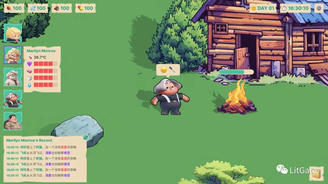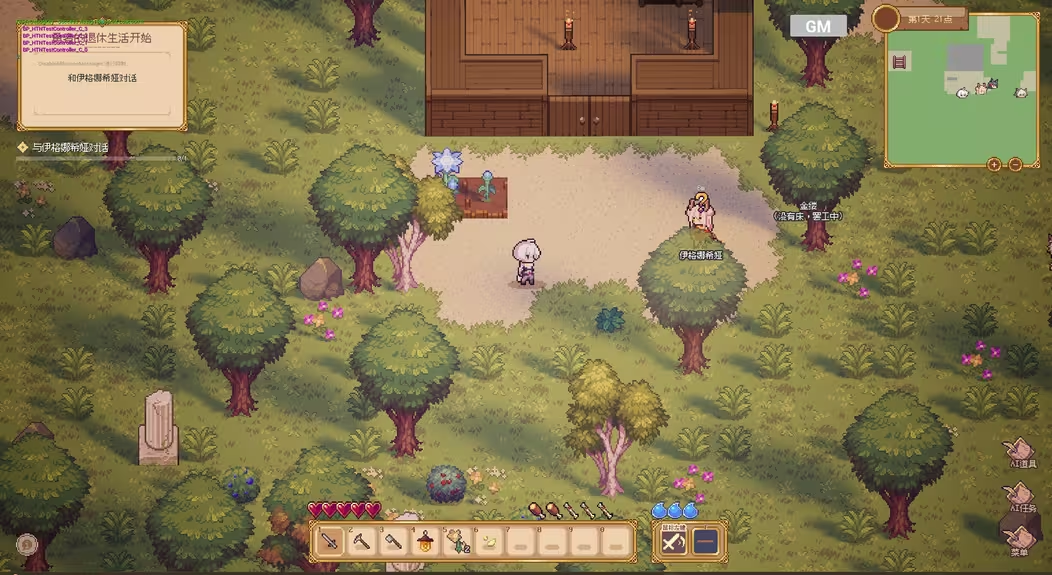 目前《麦琪的花园》的产品形态,是一款像素风沙盒游戏:玩家可以用AI捏NPC,与其交互,并完成探索、建设、互动的体验循环。随着玩家与NPC的互动深入,系统会为NPC生成专属支线任务,并且有概率生成游戏原本不存在的功能性道具和玩法规则。