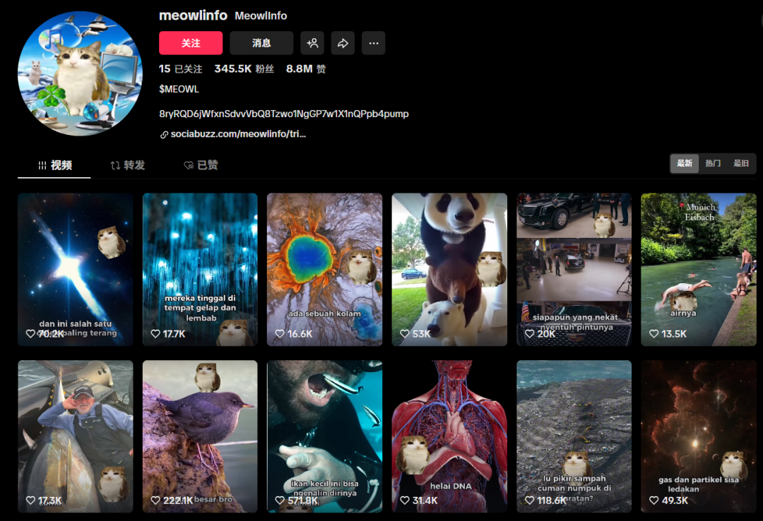 洋抖上,博主@meowlinfo对于Meowl的翻红可谓是功不可没。在他制作的科普视频中,Meowl被塑造成了一个智慧的小猫,会告诉你一些有趣的知识。