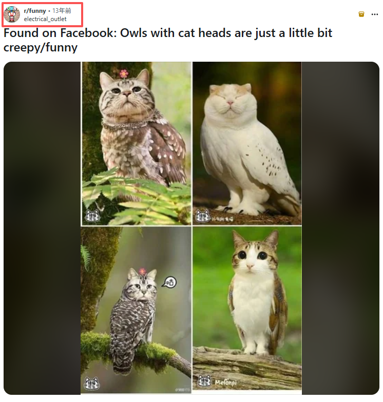 想不到的是,国外网友也很喜欢这只猫头鹰小猫,当年原作者发布没多久,就被转载到了国外论坛Reddit上。后续,他们还给它起了一个非常有趣的名字:Meowl.