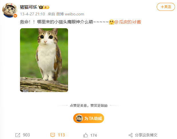 它的来源,其实是2013年博主@猪猫可乐在微博上发布的一系列猫头鹰图片的其中一张。所以,别看它有几分AI感,这可是实打实用古法PS合成的。