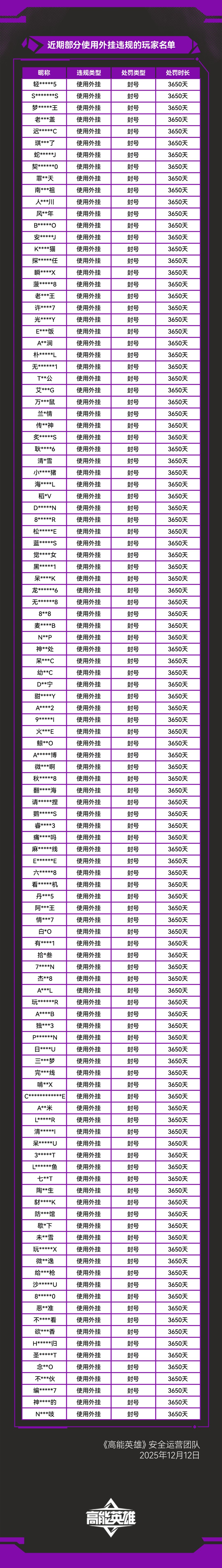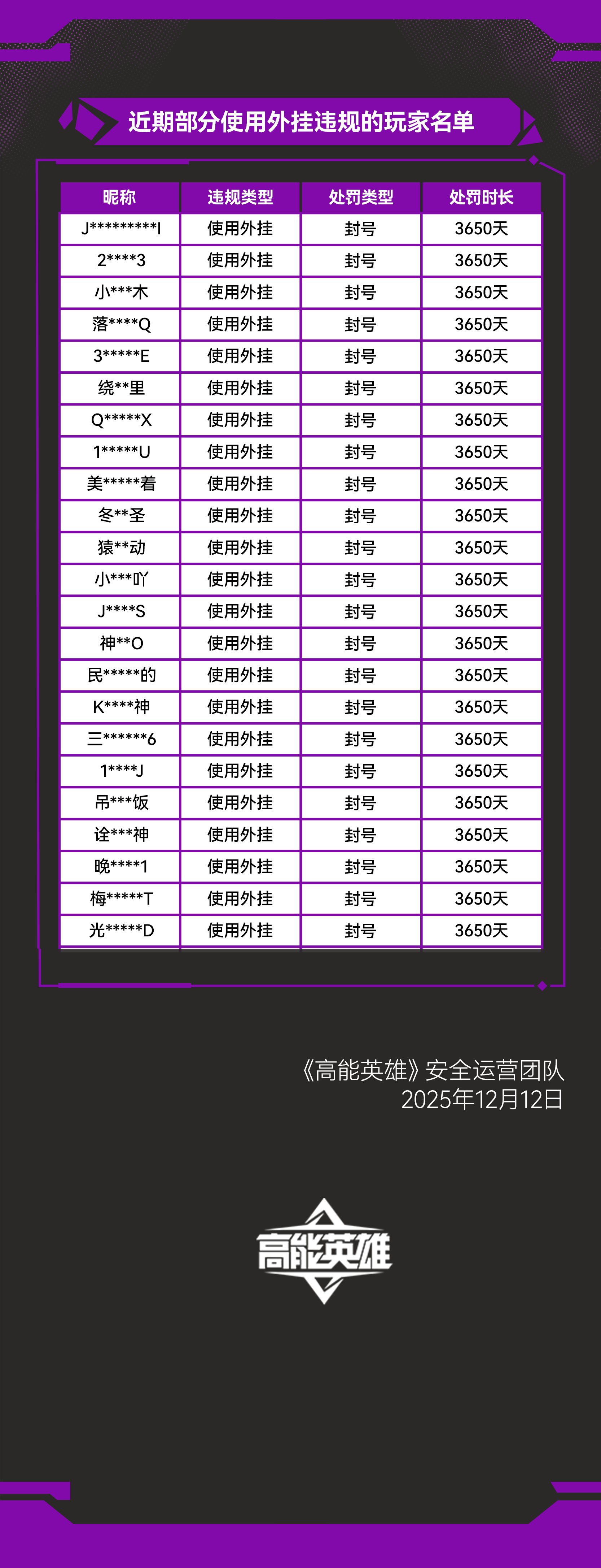 《高能英雄》外挂作弊处罚公告(12月12日)