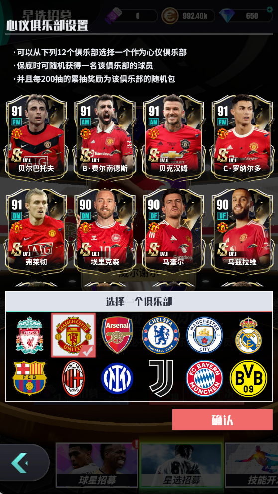 玩家可以在游戏中的星选招募中选择曼联作为自己的心仪俱乐部,增加抽到曼联球员的概率,并且保底时可随机获得一名该俱乐部的球员,并且每160抽的累抽奖励为该俱乐部的随机包。