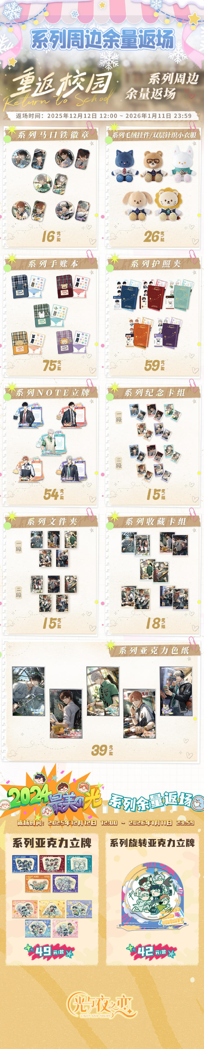 暖心雪抱、旧笺情绵·第一期和锈都余响系列限时周边新品,重返校园和2024最美的光系列余量返场,即将同时开启!