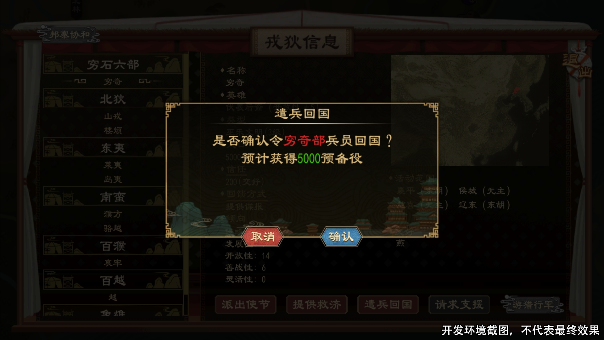 神祖穷羿担任君主或朝臣时,可消耗精力发动【邦寨协和】,派遣预备役前往指定范围组建与本势力同族域的戎狄部落,并将关系提升至交好。通过穷羿能力组建的部落,也可以通过“遣兵回国”按钮解散回国,并获得对应部落的人口充作本国预备役。