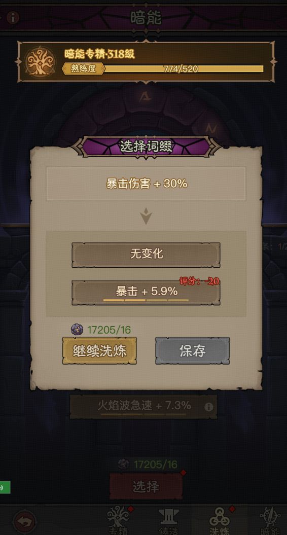 • 当对暗能进行洗炼,每消耗1个暗能精华增加10点熟练度,若有免费洗炼次数时则不会增加。