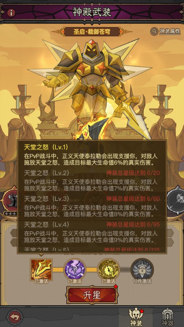 4、消耗神石可以对神装进行升星,以获得更多全局属性加成。