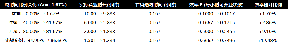 线性节省(澄清误区):无论起点是0%还是85%,相同的1.67%增量所节省的绝对时长恒为0.167小时。这确凿无疑地证明 实际营业时长与减时间比例是严格的线性关系。所谓“节省时间非线性”的认知是错误的。