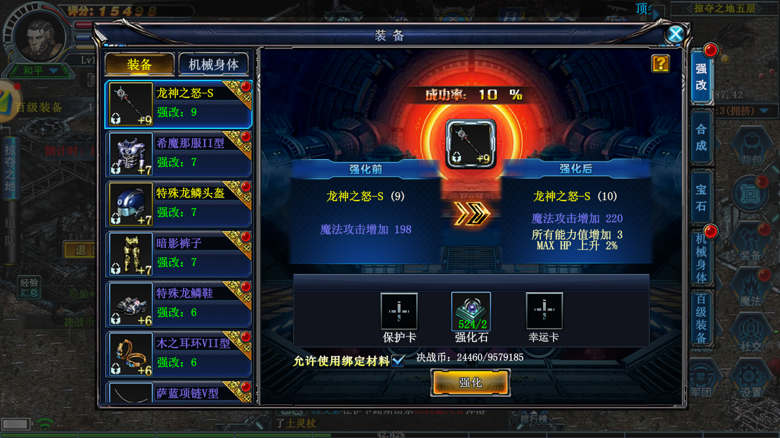 - 装备养成:3 件同类型同品质(蓝 / 金)装备可合成新装备,属性随机,可用金石、魔石替代材料,合成需支付决战币;强化石提升装备等级,1-5 级失败降 1 级,6 级及以上使用保护卡可避免装备消失;百级装备进阶需主装备强改≥8 级、副装备强改≥4 级,成功后继承主装备属性并额外抽取副装备 1 条合成属性。