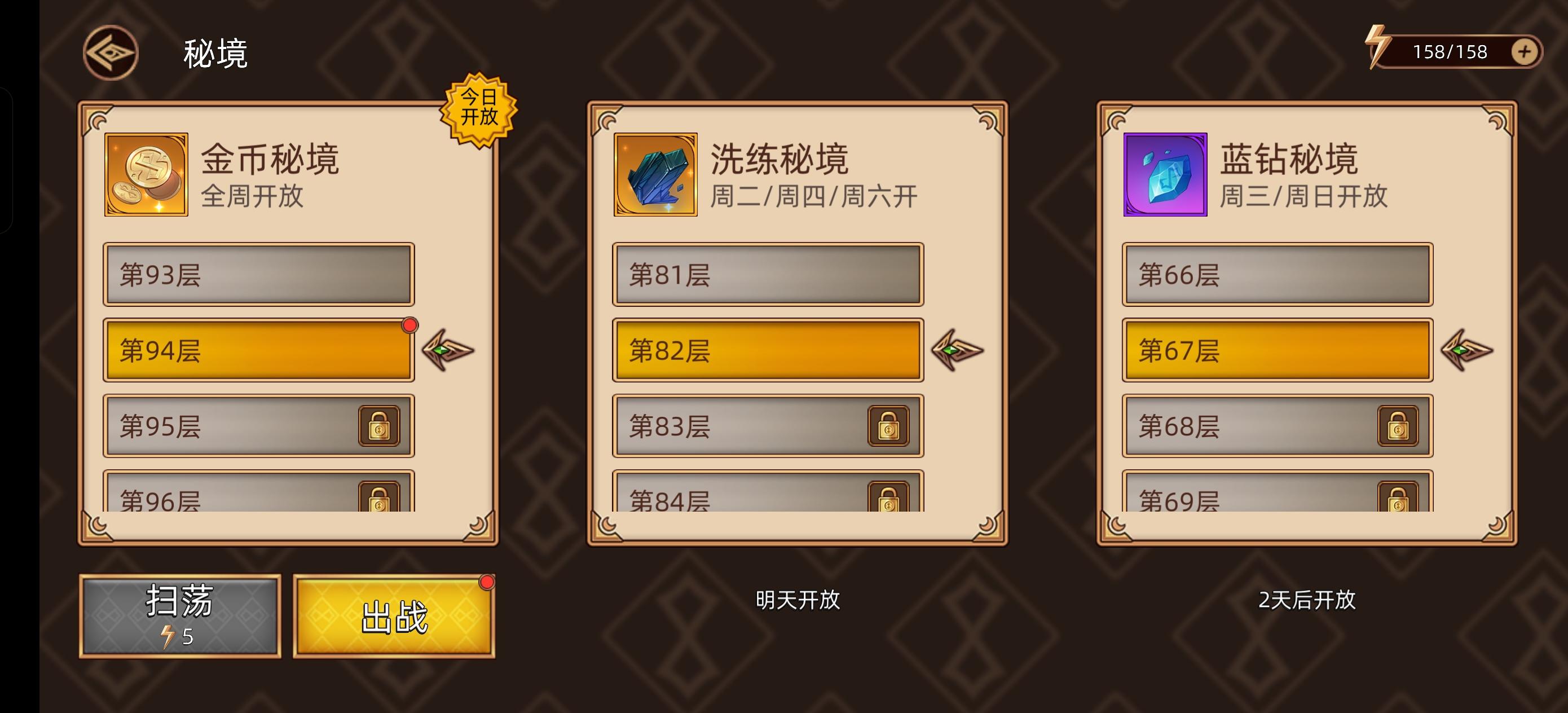 秘境:分为金币,洗练,钻石,开放进度根据主线推进进度决定,推满140-5即可解锁全部秘境层数,不推荐前期扫荡,前期体力推荐刷取宗师本。攻略技巧:开局往右上角移动到角落,一般都可挂机通关。