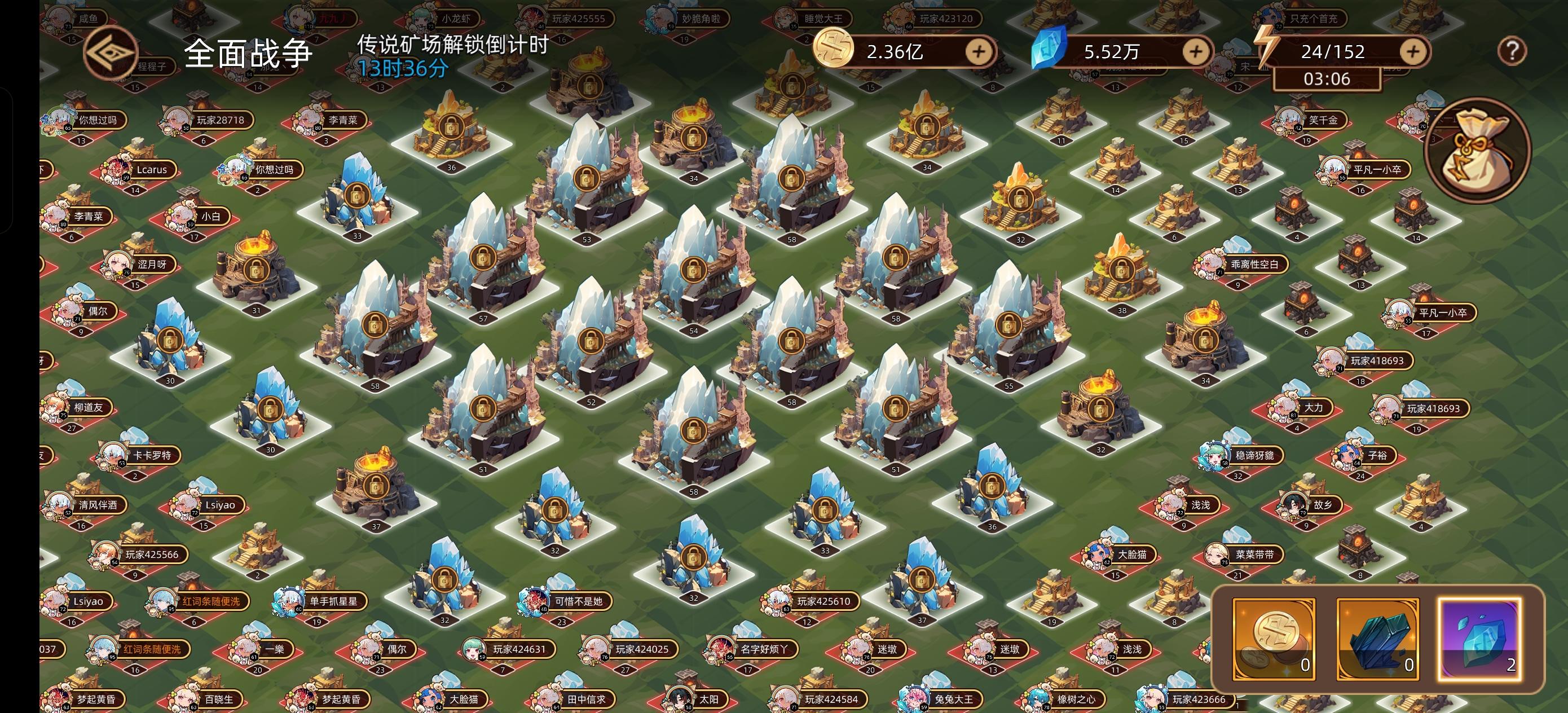 全面战争:俗称挖矿,分为金币矿、洗练石矿、钻石矿,分为史诗、传说、神话三个品质,品质越高产出越多,每打成功一次矿的等级提升一级,传说,神话矿随时间开放,产出没多少,每次还消耗一点体力,不过好玩的地方在你可以针对你的好兄弟,或者你的冤家,天天偷他的矿,伤害不大侮辱性极强。