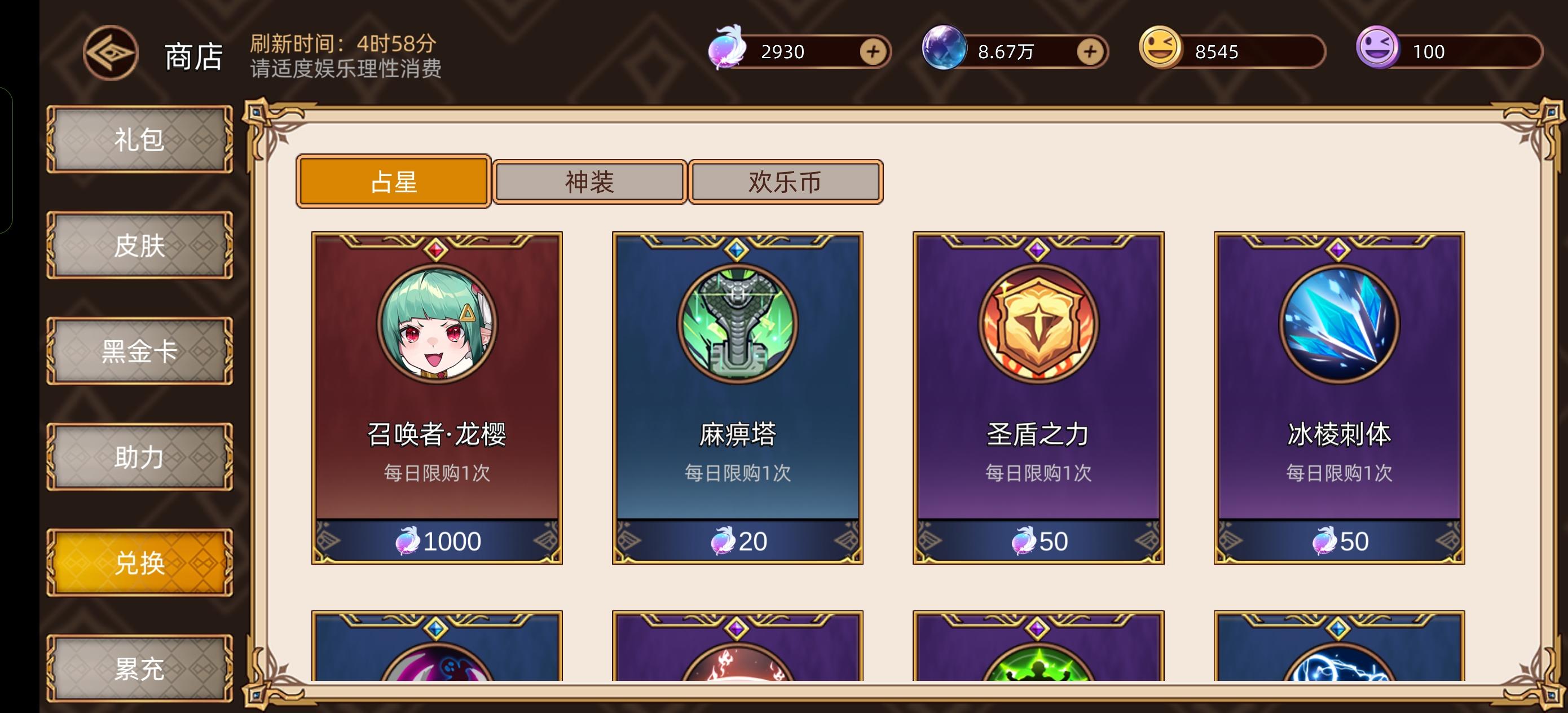 兑换:占星一般只推荐兑换角色和需要的神话和传说技能。神装只推荐换取后面两个,欢乐币全部换完。
