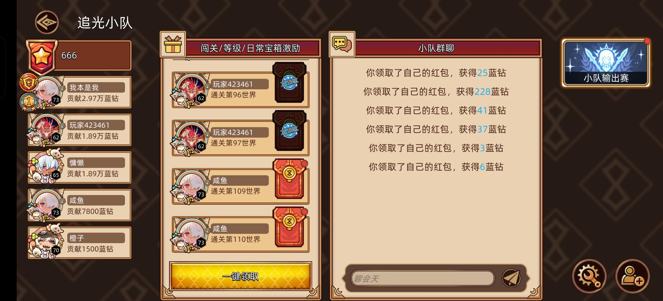 追光小队:相当于公会战,里面的小队相当于一个小型公会,可以把小队链接发给别人(为什么不可以出个审核制,或者出个邀请他人的操作,需要小队还只能去公屏喊话,对社恐玩家不友好),队友获取每日奖励和主线通关奖励全队均可获取钻石奖励。