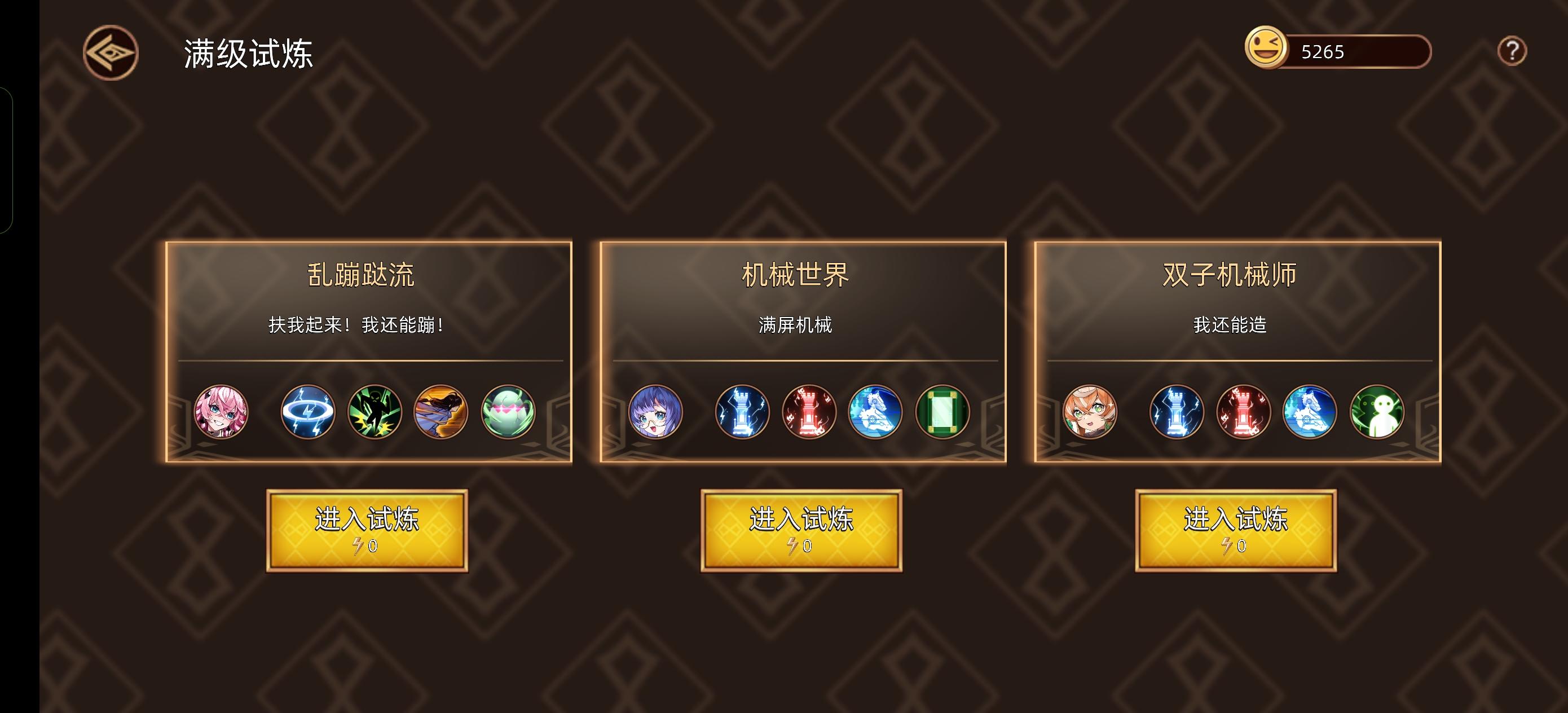 满级试炼:娱乐小游戏,主要是体验角色的不用技能搭配,每日刷新三次,推荐每日游玩,因为加荣誉值和成就。