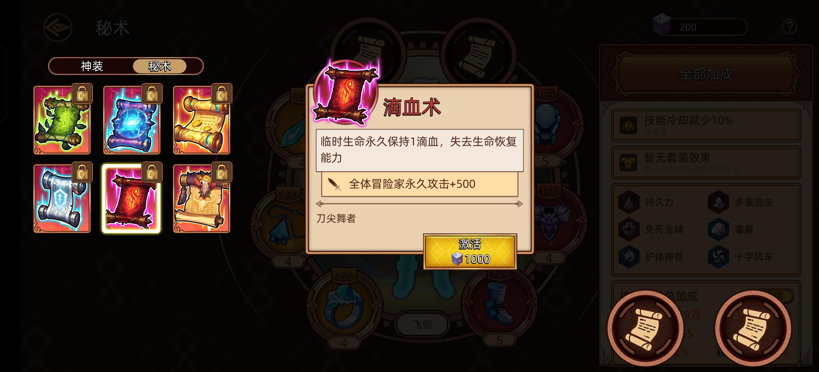 秘术:比较有用的是滴血术(配合玩命加上等价交换可以数以百倍提升攻击),通灵术(多带个宠物),生财术(对百分之10金币收益,一步快步步快),缺点是获取周期长,不氪需两个月半才可解锁滴血术。
