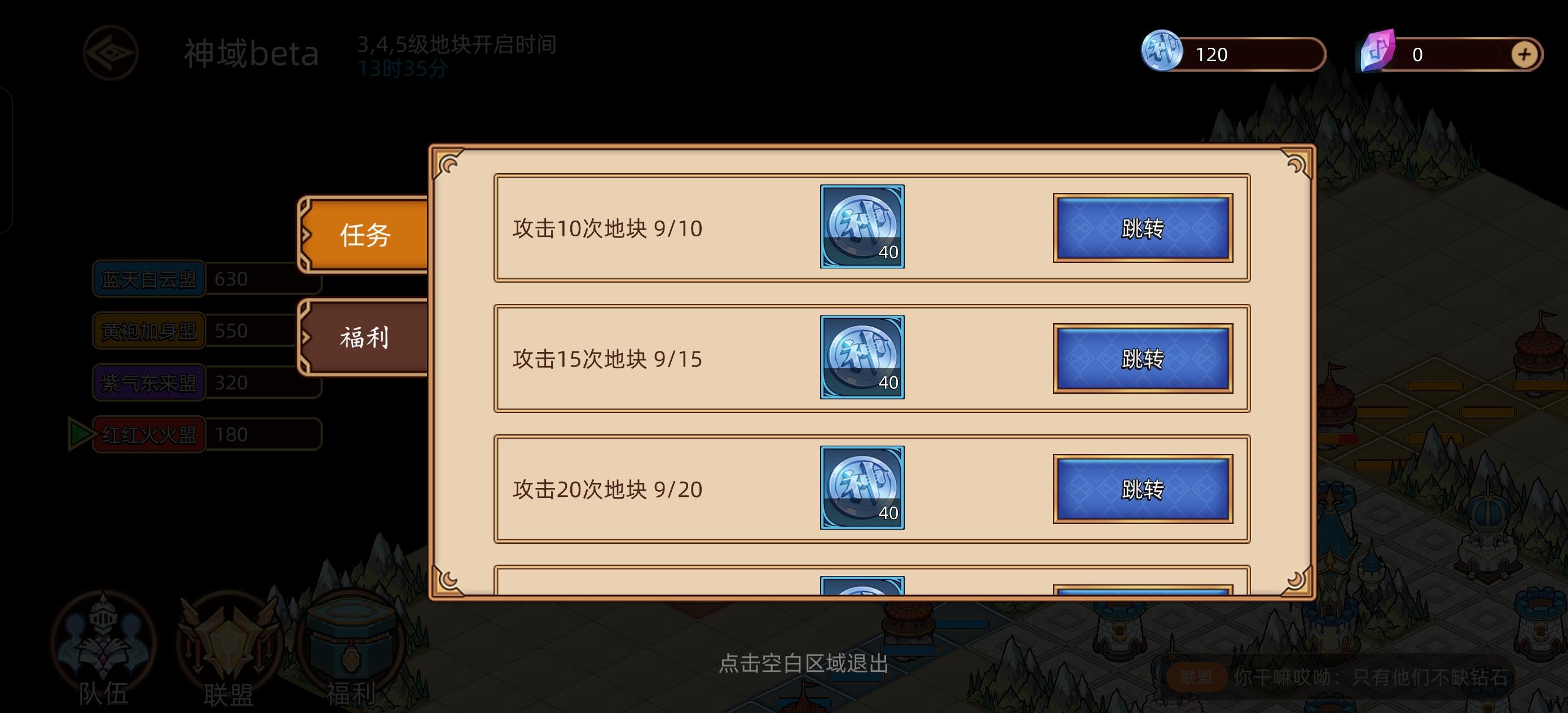 神域:每周四报名,每周五零点开启,为期三天,玩家进去按照等级平均分配到每个盟(有些等级高也水的很,纯粹扫荡扫的多),神域现在其实还不是很公平,因为氪佬单方面可以秒杀一路,打个比方,氪佬死干我们盟,我们全盟都守不住他一个人,其他玩家毫无游戏体验,希望以后可以改进一下。
