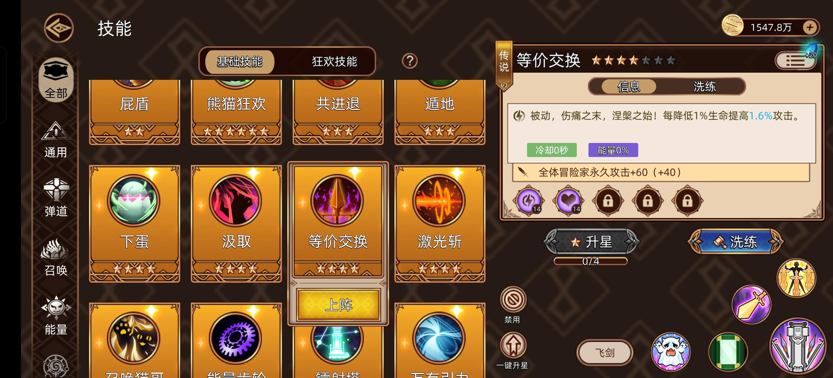 闯关:也就是主线,更新到140-5,萌新刷到70-1即可。其他体力刷取宗师。一层分为五个小关,一般由四个小关和一个大关组成,关卡分别为镜像战,连选天赋战,融合战,多选技能战,各选一个技能战,10关战,20关战,30关战,这里主要讲各选技能战,如果两个技能都很恶心,可以直接都不选,那BOSS就无法获取技能。打不过可以带黑洞进去。