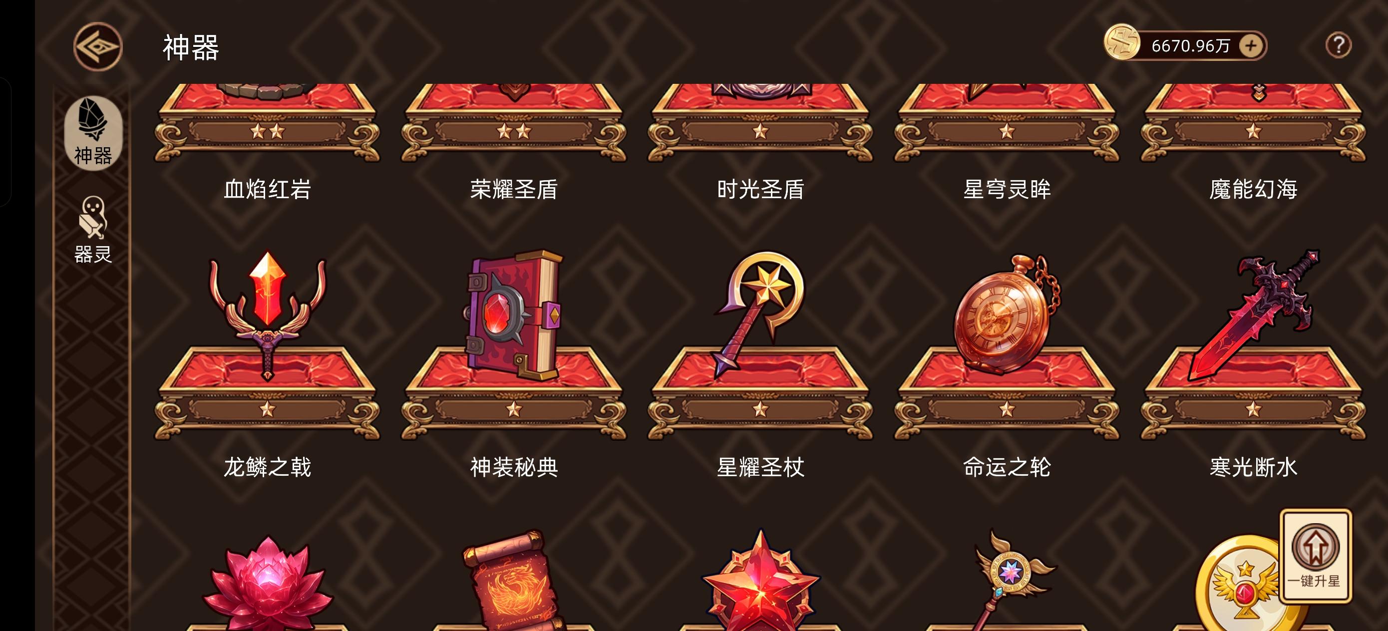 神器:分为神器和器灵,神器根据完成的各项任务给予数值提升,优先考虑神装秘典和星耀圣杖,因为这两件叠的快。