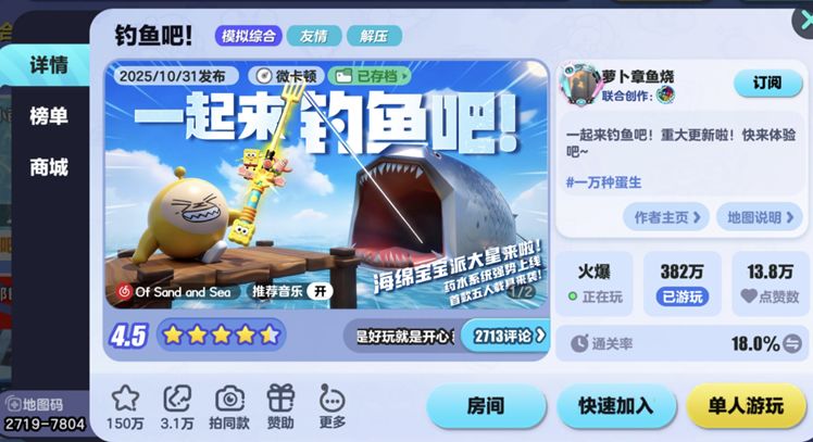 这款斩获14万点赞和超过380万游玩的钓鱼模拟地图,其实仅仅上线一个月,主要通过提供丰富场景与多样的趣味钓鱼体验,搭载图鉴收集与排行榜等多元玩法来吸引玩家。而令我更惊奇的是,它已经拥有了长期更新和运营计划,不仅定期迭代版本、上线新活动,甚至还推出了热门蛋仔联动IP的定制鱼竿、多人载具,在一系列精巧的付费设计中获取了稳定的营收。