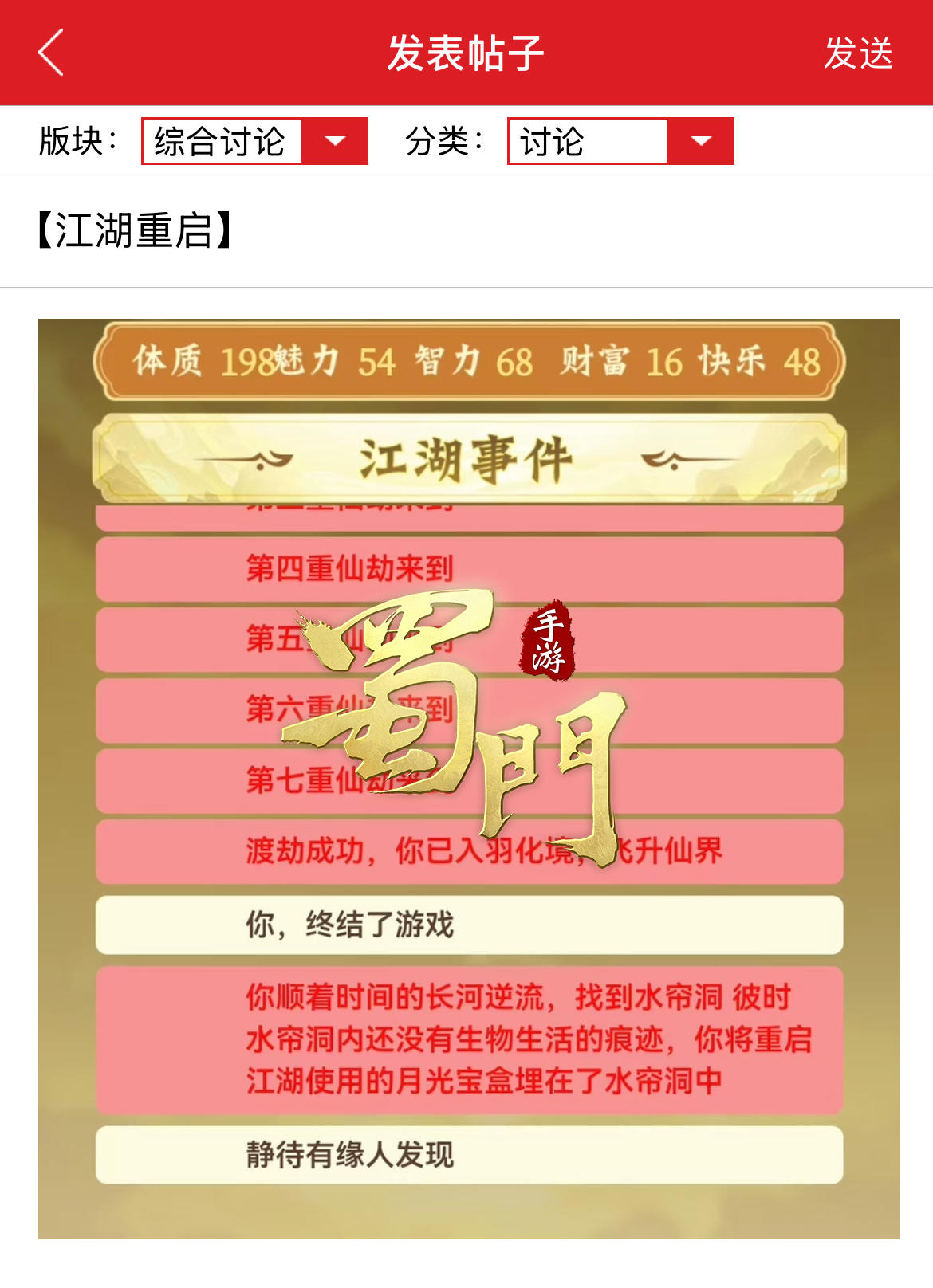 即刻起至12月15日23点前,前往蜀门手游官方社区论坛,带话题【江湖重启】,晒出你的江湖事件或飞升成仙结局截图,门叔将随机抽取6位幸运蜀友获得超值礼包一份~