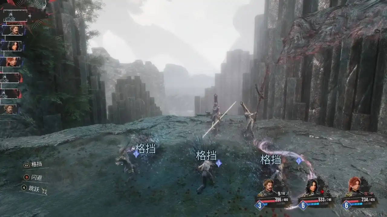 在本作中,回合制战斗被赋予了许多的“动作感”。不同于单纯的你一刀我一刀的战斗,玩家可以通过多种的方式来应对敌方进攻:闪避,弹反,跳跃,特殊弹反,这些都需要玩家根据敌人的招式来按下相应的按键。